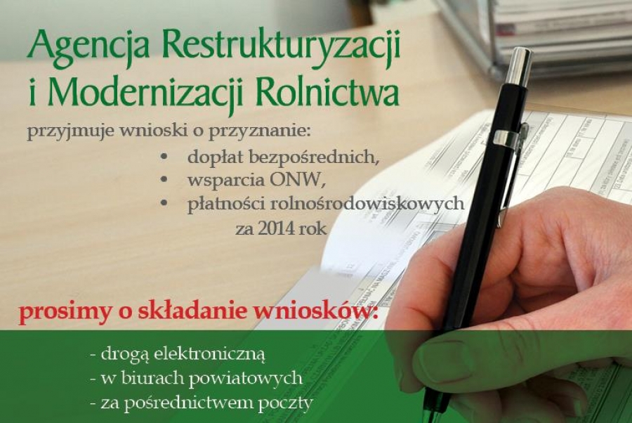 od 15 marca 2014 r. do 15 maja 2014r do ARiMR można składać wnioski o przyznanie płatności bezpośrednich, płatności ONW, płatności rolnośrodowiskowych oraz wnioski o wypłatę pomocy na zalesianie gruntów rolnych oraz gruntów innych niż rolne w ramach PROW 2007 - 2013 za 2014 r Rolnicy, którzy złożą swoje wnioski po tym terminie, ale nie później niż do 9 czerwca 2014 r., otrzymają pomniejszone należne im płatności o 1% za każdy roboczy dzień opóźnienia. Zmiany do już złożonego wniosku można składać bez żadnych sankcji finansowych do 2 czerwca 2014 r. Korekty wniosków złożone po tym terminie, ale nie później niż do 9 czerwca, będą obarczone sankcjami finansowymi polegającymi na pomniejszeniu należnych dopłat o 1% za każdy roboczy dzień opóźnienia. Godziny przyjmowania wniosków Od dnia 17 marca do 11 maja w godzinach 7:30-15:30 Od dnia 12 maja do 15 maja w godzinach od 6:00-22:00 Od dnia 16 maja do dnia 9 czerwca w godzinach od 7:30-15:30 Przyjmowanie wniosków odbywać się będzie tylko w dniu robocze od poniedziałku do piątku.