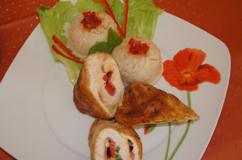 I miejsce uczennice - Maria Gapys i Dominika Zieja z kl .IV T ża - Roladki z kurczaka nadziewane kolorową papryką z ryżem i sosem chili