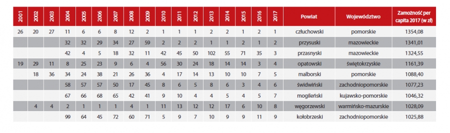 Według rankingu zamożność per capita powiatu w 2017 roku to 1341,01 zł. Warto przypomnieć, że powiat przysuski był sklasyfikowany w każdej edycji rankingu od 2004 roku, a od 2010 roku zajmuje regularnie I lub II miejsce. Zastosowana metoda obliczania wskaźnika użytego w rankingu jest identyczna jak rok temu. Podobnie jak w zeszłym roku pominięte zostały wpływy z dotacji celowych. Zwłaszcza w okresie tak intensywnego korzystania z funduszy unijnych dotacje mają chwilowy, ale bardzo silny wpływ na wielkość dochodów. Wpływ wielkiej dotacji inwestycyjnej potrafi wywindować samorząd w rankingu. Jest to awans chwilowy (incydentalny) i nie mający związku z trwałym wzrostem zamożności. Wydaje się więc, że uwzględnienie tylko dochodów własnych i otrzymywanych subwencji lepiej oddaje hasło rankingu („zamożność”). Zajmowanie czołowych miejsc w rankingu jest efektem wieloletnich konsekwentnych działań podejmowanych w powiecie przysuskim w dziedzinie wzmacniania niwy finansowej. Dokonany ogromny postęp to wynik zdecydowania i ciężkiej pracy starosty Mariana Niemirskiego i jego samorządowych współpracowników, którzy dążą do jak najlepszego realizowania zadań publicznych powierzonych przez społeczność powiatu. W tym przypadku porządek finansowy jest pochodną uporządkowania sytuacji w jednostkach powiatowych. Okres intensywnej reformy zrealizowały praktycznie wszystkie powiatowe instytucje. Władze samorządowe przeszły drogę od likwidacji zadłużenia, przez restrukturyzację, przebudowę infrastruktury, aż po chwilę obecną, czyli czas ustabilizowanego funkcjonowania. Każde działanie publiczne musi czemuś służyć, a najlepszym przykładem jest tutaj oświata, która od lat jest „oczkiem w głowie” starosty Mariana Niemirskiego. Praktycznie do końca został zrealizowany projekt inwestycyjno-restrukturyzacyjny, którego wynikiem było znaczne zwiększenie zatrudnienia w całej oświacie i zbudowanie nowej infrastruktury edukacyjnej. Mieszkańcy powiatu przysuskiego zauważają swoją przewagę nad mieszkańcami sąsiednich powiatów chociażby poprzez dostęp do nowoczesnej bazy diagnostycznej w szpitalu powiatowym, likwidację wykluczenia cyfrowego w postaci przekazania 2400 rodzinom laptopów z dostępem do bezpłatnego internetu, możliwość kształcenia zawodowego dla młodzieży w nowo oddanym do użytku Centrum Kształcenia Zawodowego. Dzieci i młodzież z terenu powiatu ma możliwość bezpłatnej nauki pływania na Powiatowej Krytej Pływalni. Na bieżąco poprawiana jest sytuacja dróg powiatowych, która szczególnie w bieżącej kadencji stała się priorytetowym obszarem aktywności władz powiatu. Bardzo ambitne założenie wyremontowania i przebudowy 100 km dróg powiatowych w ciągu czteroletniej kadencji samorządu wydaje się być możliwe do realizacji. Do samej nawierzchni dróg powiat dokłada w tej kadencji również kilometry ciągów pieszych oraz budowane od nowa mosty na ciekach wodnych. Wyraża się to w wielomilionowych inwestycjach realizowanych we wszystkie dziedzinach odpowiedzialności powiatu. Co bardzo ważne, powiat nie unika inwestycji w sprawy społeczne – częstokroć traktowane jako najmniej ważne, bo nieopłacalne. Tymczasem w bieżącej kadencji powstał i już wkrótce rozpocznie swoje funkcjonowanie nowoczesny i pięknie wyposażony Zakład Opiekuńczo Leczniczy w Borkowicach wraz z Dziennym Domem Opieki Senior +. Powstanie nowego ZOL-u to powód do szczególnej satysfakcji Zarządu i Rady Powiatu, ponieważ to uzupełnienie bardzo ważnego braku na mapie instytucji powiatowych o wyspecjalizowany ośrodek świadczący swoje usługi na rzecz seniorów, o których tak łatwo się zapomina. Warto podkreślić fakt, że wieloletnie, rozsądne działania w dziedzinie finansów pozwoliły zbudować w powiecie przysuskim sytuację, w której generalny problem na dziś polega na podjęciu decyzji, która z najpilniejszych potrzeb bieżących będzie realizowana w pierwszej kolejności, a nie skąd będą wzięte pieniądze.