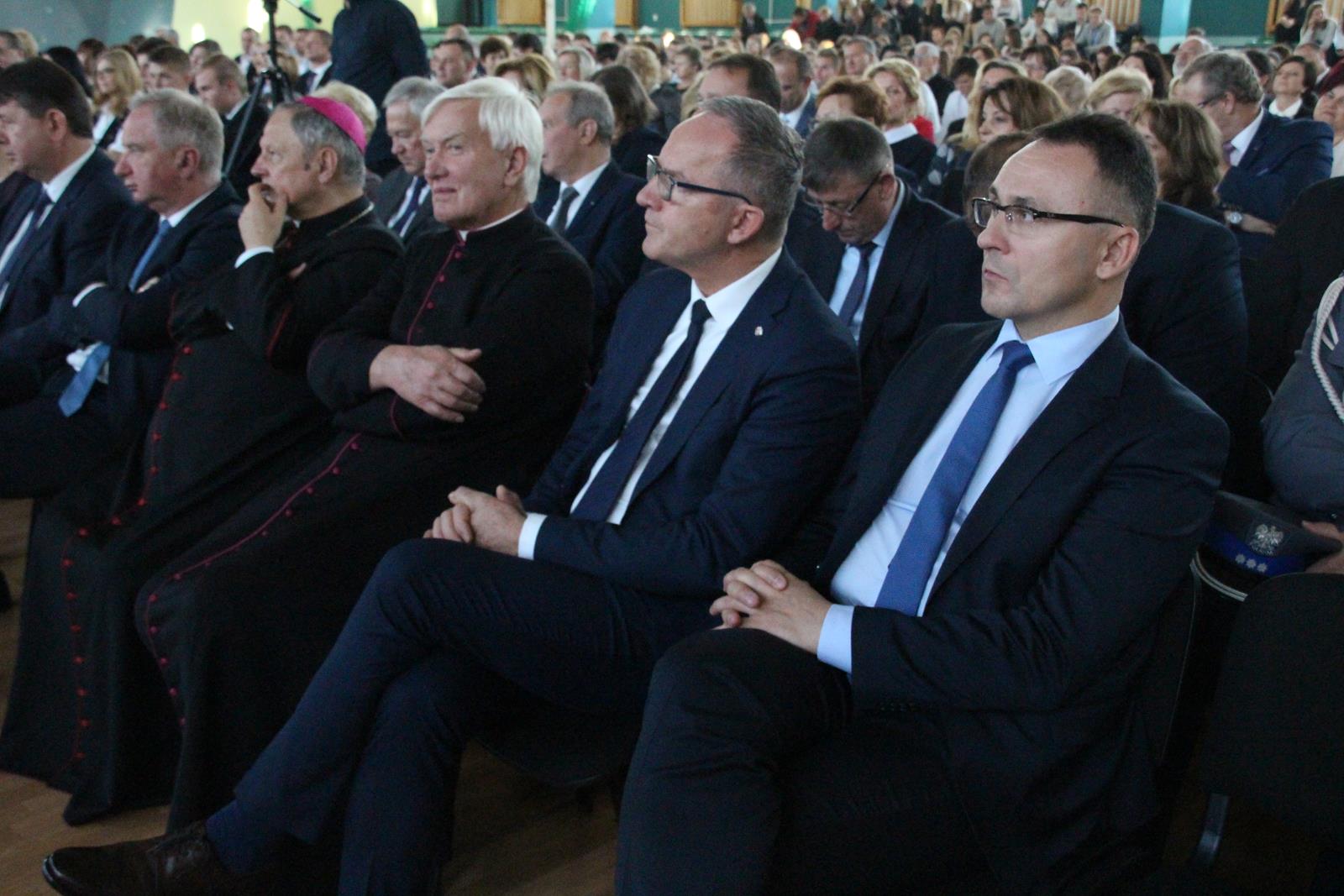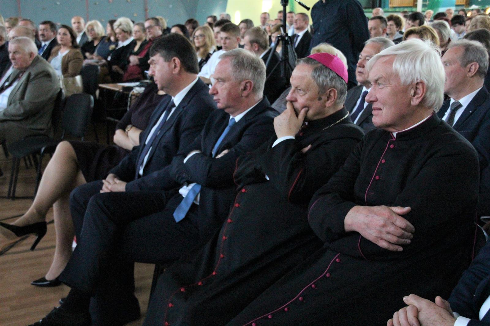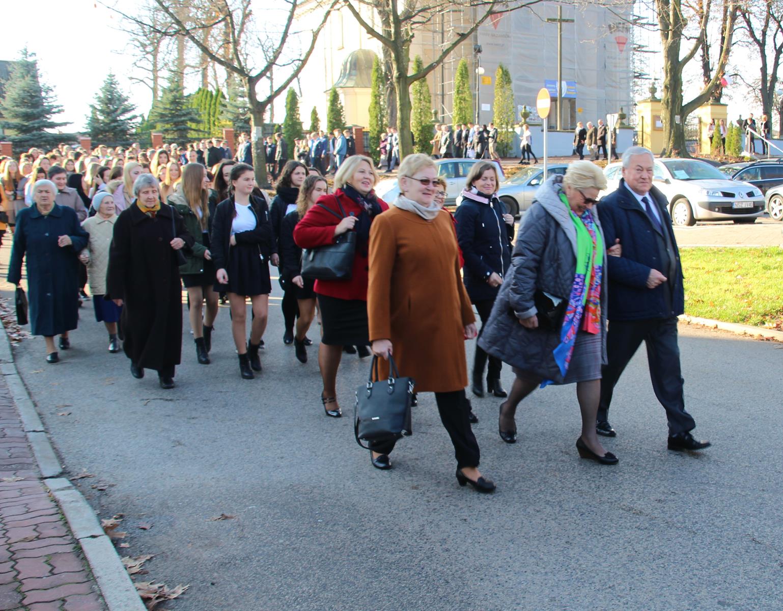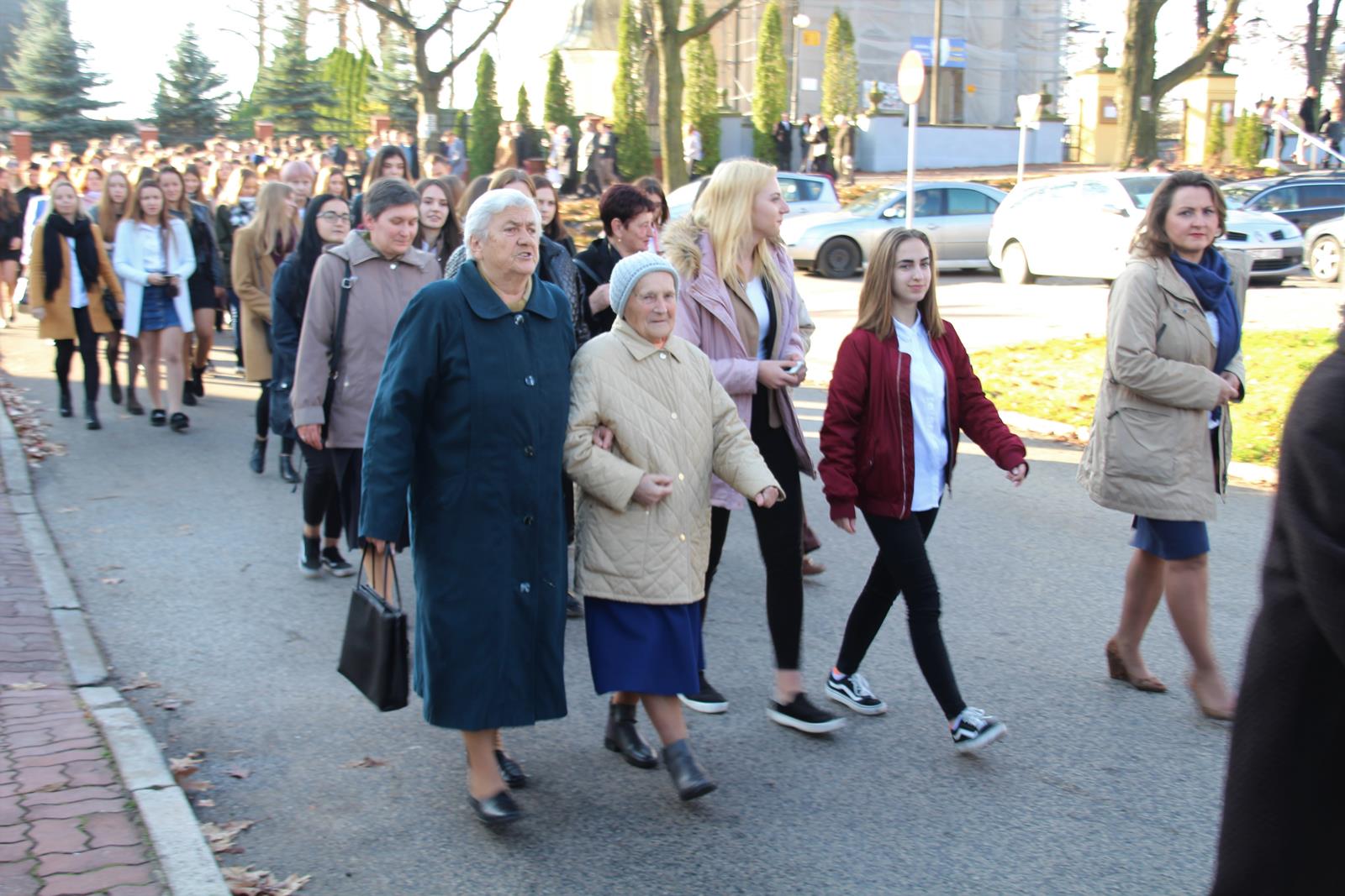 Po mszy goście przeszli ulicami miasta do hali sportowej przy akompaniamencie Powiatowej Młodzieżowej Orkiestry Dętej "Vox Cordium".