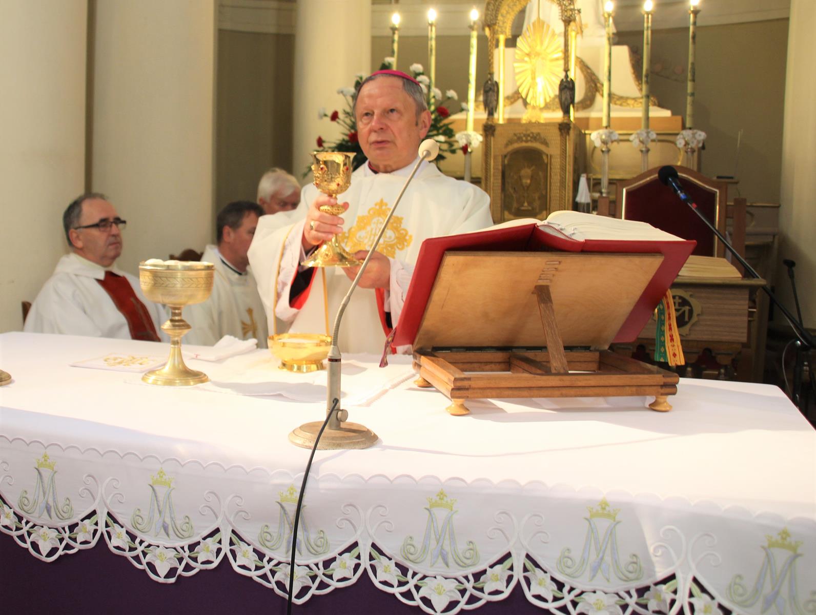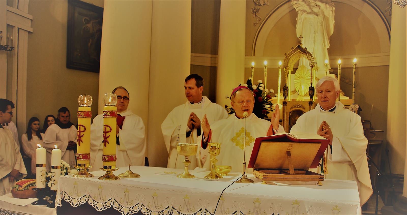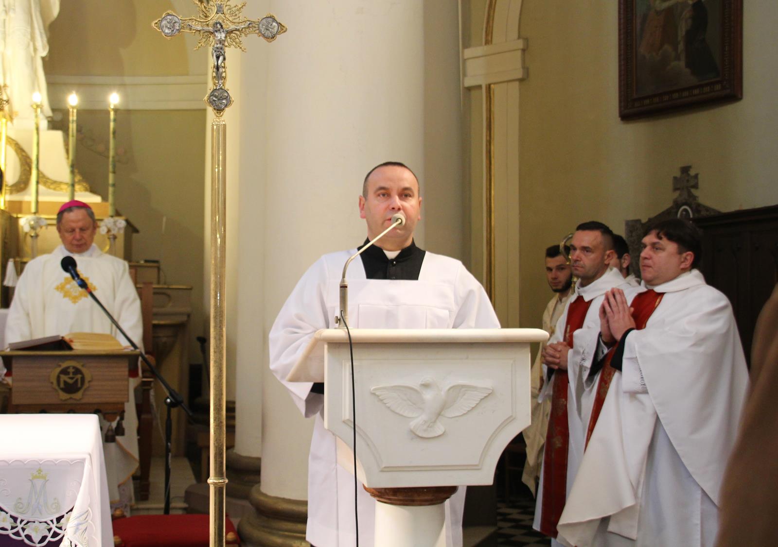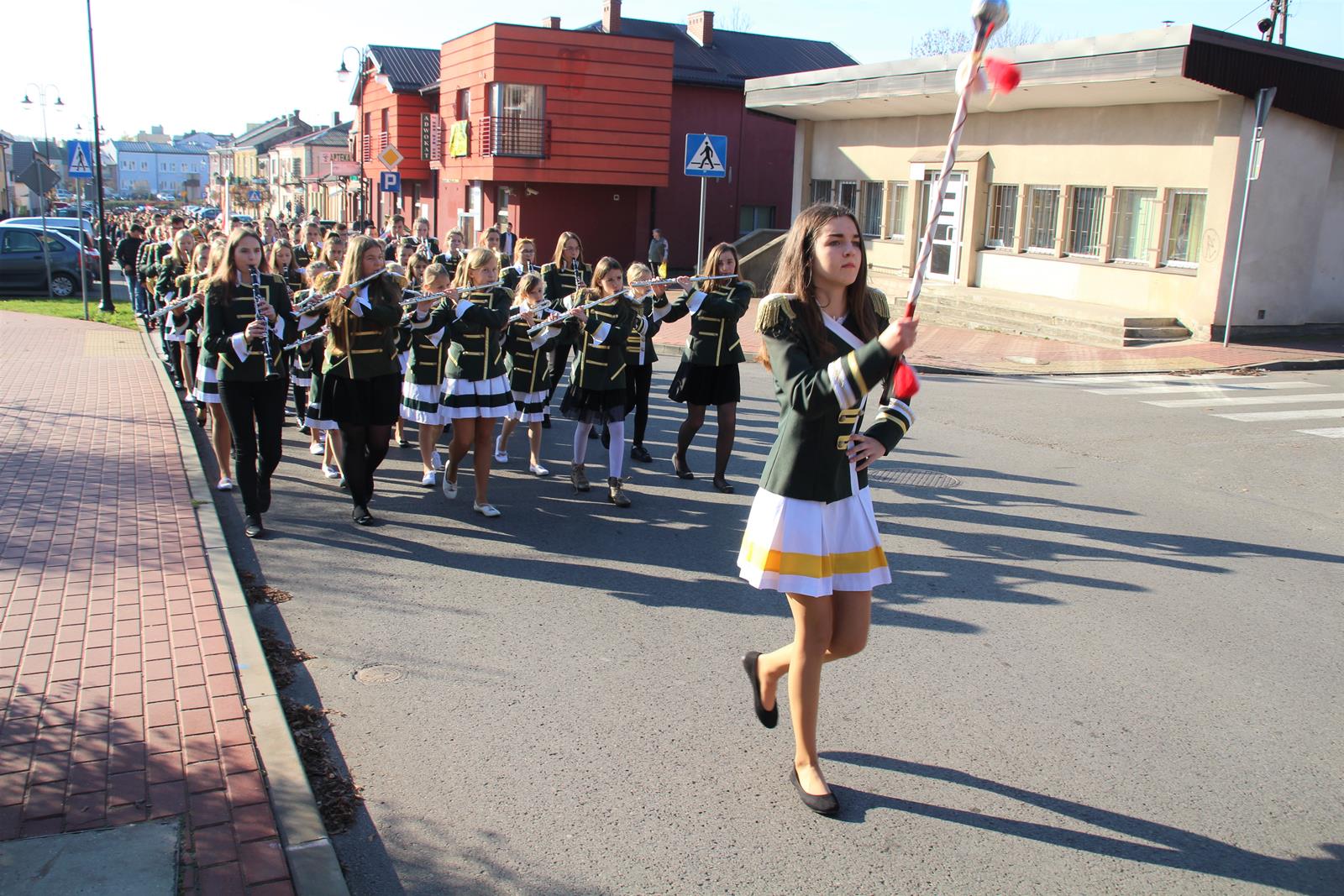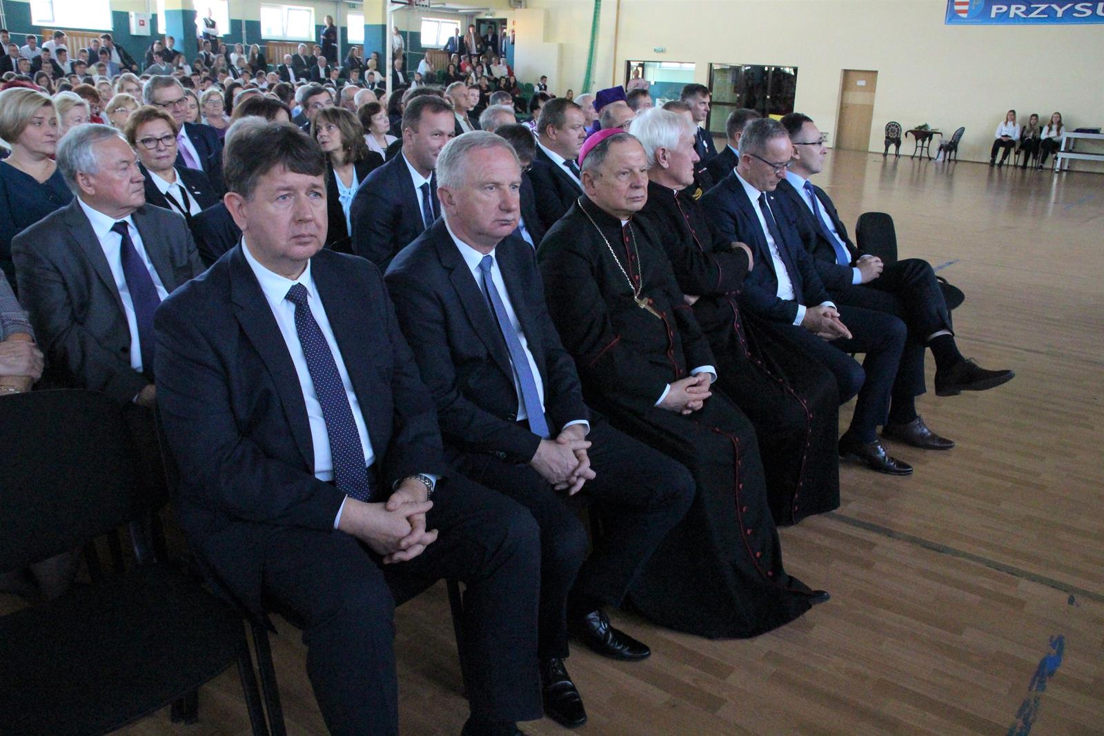 Po mszy goście przeszli ulicami miasta do hali sportowej przy akompaniamencie Powiatowej Młodzieżowej Orkiestry Dętej "Vox Cordium".