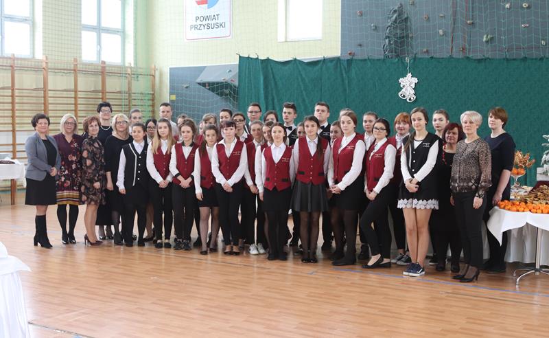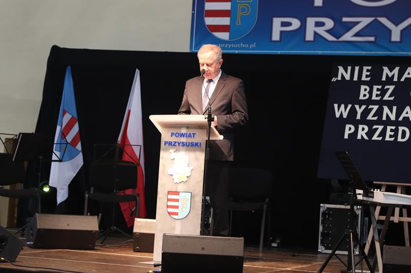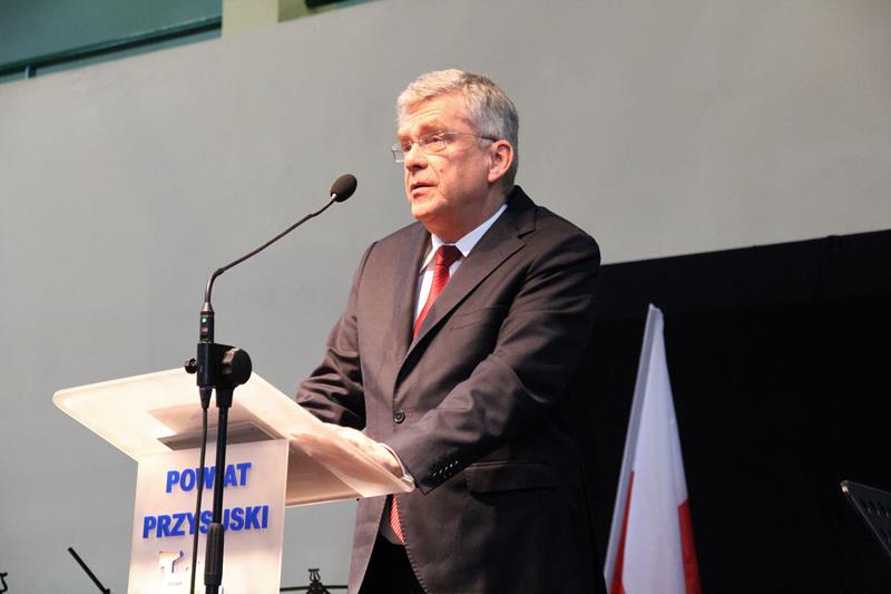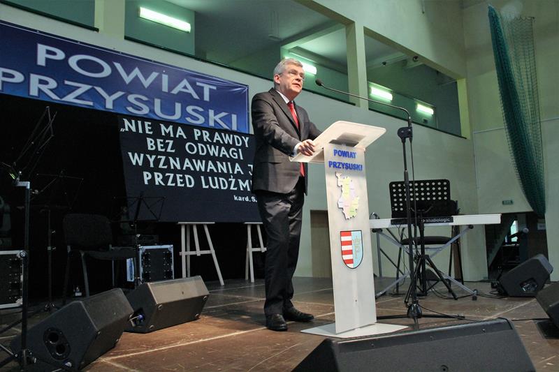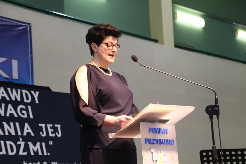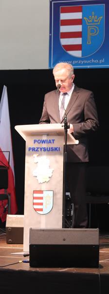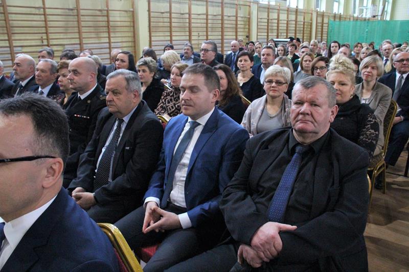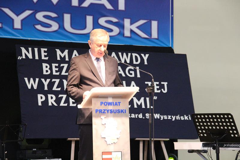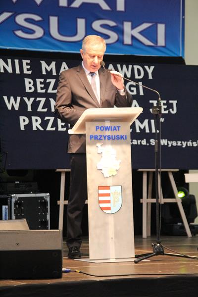 Jak co roku spotkanie znakomicie poprowadziła Pani Małgorzata Bednarska- dyrektor ZS nr 2. Po krótkim powitaniu przybyłych gości głos zabrał Starosta Marian Niemirski, który w swoim przemówieniu nawiązał między innymi do służby i pracy na rzecz rozwoju Ojczyzny oraz wierności pryncypiom. Oto jego fragment: (…)W dzisiejszym szalonym świecie warto się na chwilę zatrzymać i odpowiedzieć sobie na najważniejsze pytania dotyczące nas samych. Skąd taka refleksja ? Ponieważ mierząc się z problemami codzienności gubimy z pola widzenia sprawy o kluczowym, najważniejszym znaczeniu. Co jest naszą powinnością, co naszą koniecznością, a co nam wolno ? Odpowiedzi na tak zdefiniowane problemy znajdują się w nas samych, w ludziach, którzy nas otaczają i sprawach, którymi się zajmujemy. Według mojej opinii naszą powinnością jest służba, koniecznością – wierność pryncypiom i honor, a wolno nam prowadzić Ją - Najjaśniejszą Rzeczpospolitą do rozwoju, a naród do dobrobytu. To przynależy wszelkim funkcjom publicznym i jest obligatoryjnym składnikiem odpowiedzialności wobec Suwerena, jakim jest Naród. Z tak rozumianej działalności publicznej bezpośrednio wynikają najwyższe wartości skupiające się na pracy dla dobra wspólnego, rozumianego jako dążenie do budowy takich warunków rozwoju społecznego i ekonomicznego, który pozwala jednostkom, bądź grupom społecznym pełniej i łatwiej osiągać własną doskonałość. Proszę zwrócić uwagę, że bez względu na poziom funkcjonowania w strukturach władzy, czy jest to poziom centralny, czy lokalny, obowiązują te same zasady i nakazy.