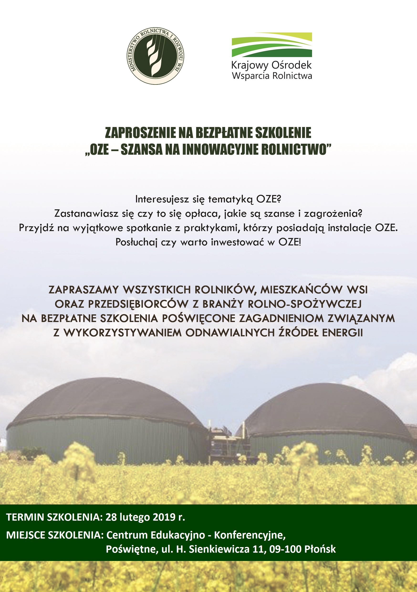Zaproszenie na bezpłatne szkolenie "OZE - szansa na innowacyjne rolnictwo"