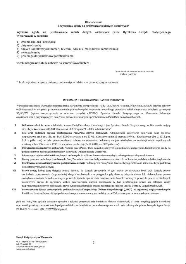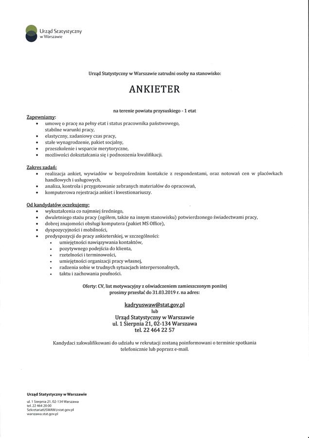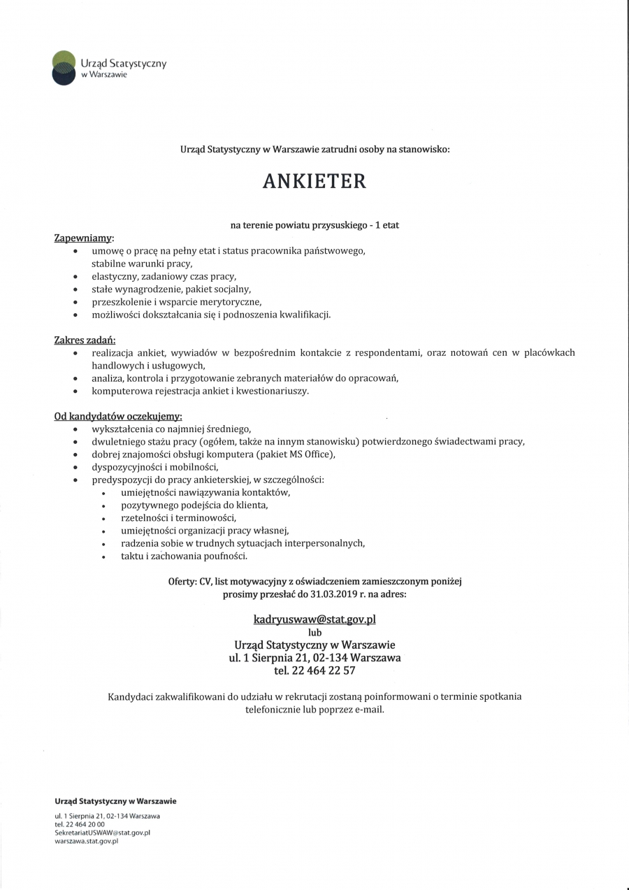 Urząd Statystyczny w Warszawie zatrudni na stanowisko - Ankieter