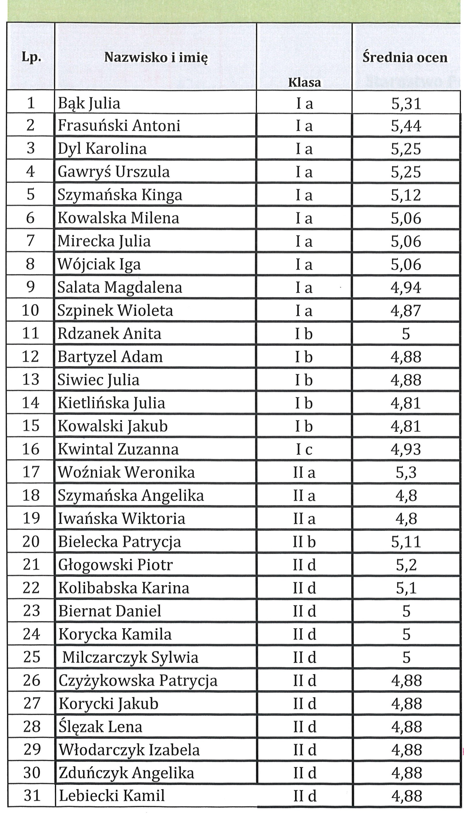 Najlepszymi w tym roku okazali się: Bąk Julia ze średnią 5,31, Frasuński Antoni 5,44, oraz Dyl Karolina 5,25.