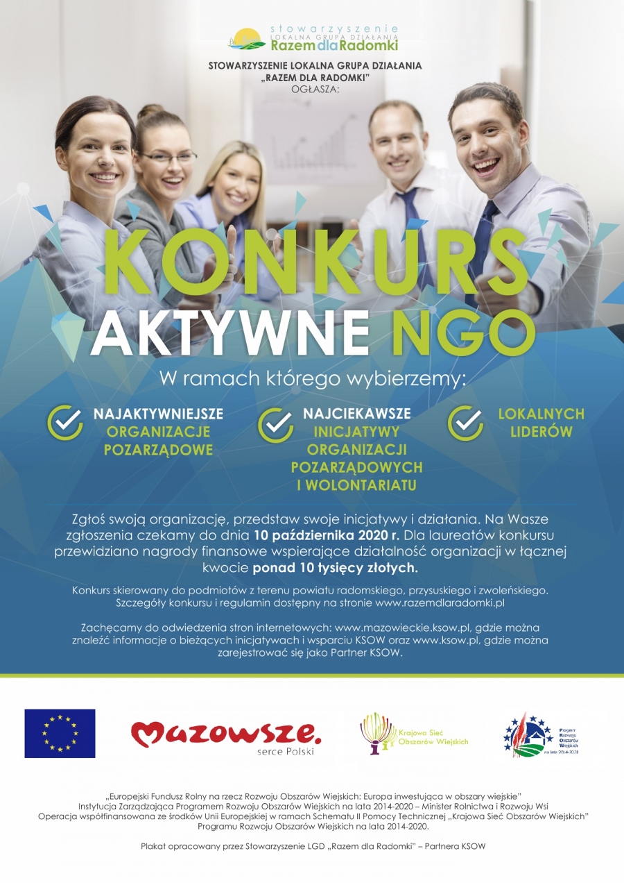 Konkurs realizowany jest w ramach projektu pn. "Liga Aktywnych Organizacji Pozarządowych", zadania dofinansowanego w ramach Planu Operacyjnego na lata 2020-2021 Krajowej Sieci Obszarów Wiejskich 2014-2020 dla Województwa Mazowieckiego na 2020 rok.