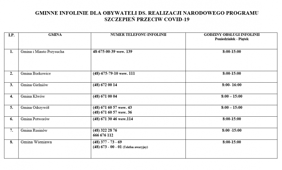 GMINNE INFOLINIE DLA OBYWATELI DS. REALIZACJI NARODOWEGO PROGRAMU SZCZEPIEŃ PRZECIW COVID-19