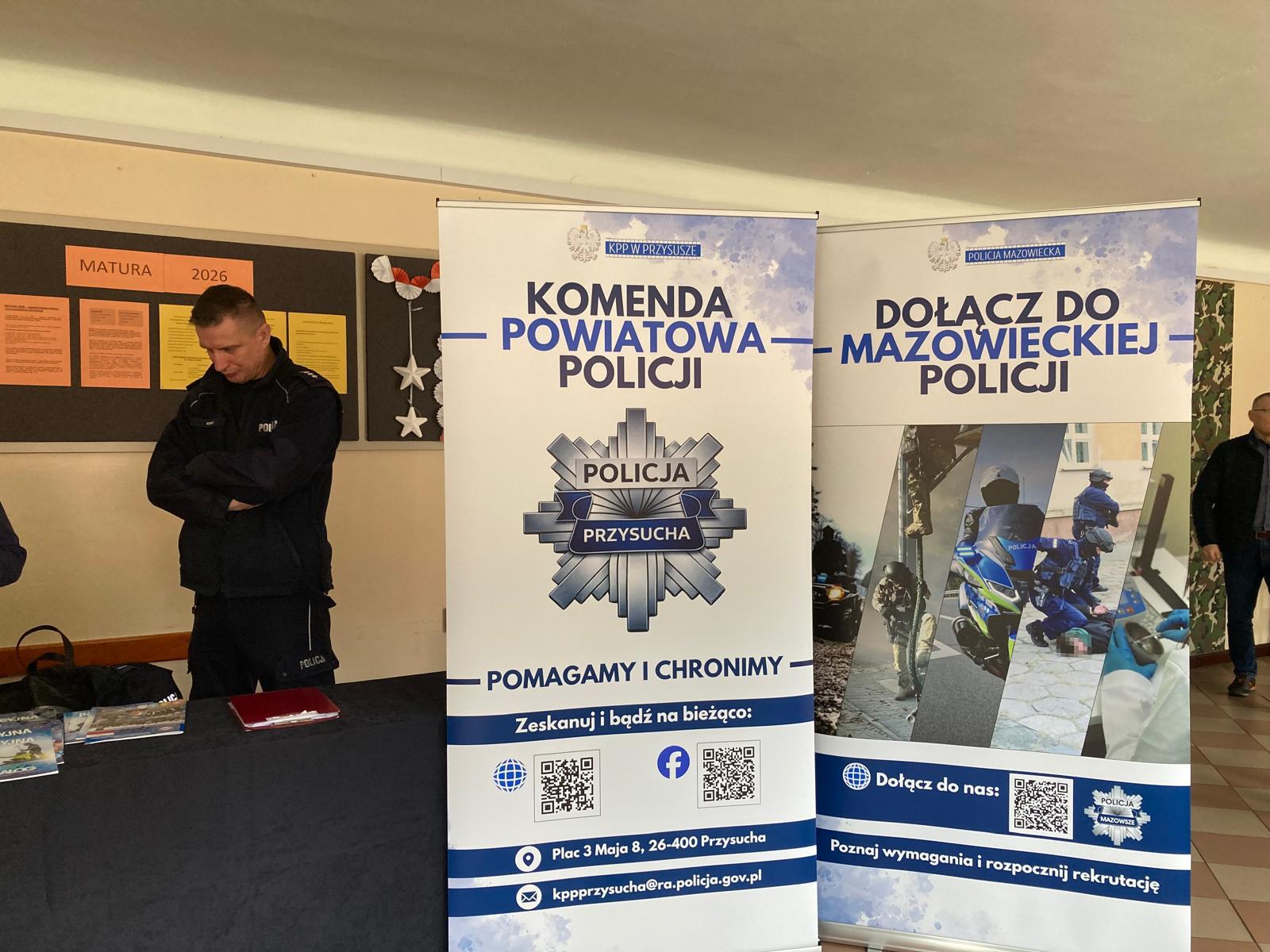 Swoją ofertę zaprezentowały również służby odpowiedzialne za bezpieczeństwo publiczne – Komenda Powiatowa Państwowej Straży Pożarnej w Przysusze oraz Komenda Powiatowa Policji w Przysusze, przybliżając specyfikę pracy w swoich formacjach oraz możliwości rozwoju zawodowego.