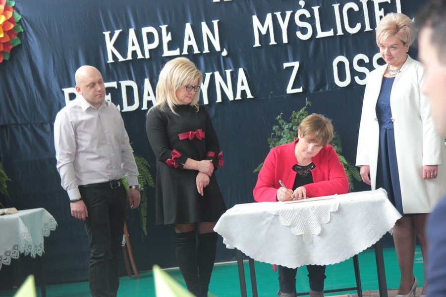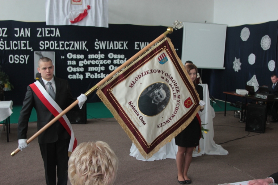 16 marca 2017 r. w Młodzieżowym Ośrodku Wychowawczym w Kolonii Ossa odbyła się uroczystość nadania imienia księdza Jana Ziei. Przygotowania do tej historycznej dla całej społeczności szkolnej chwili trwały kilkanaście miesięcy. W tym czasie podjęto szereg działań mających na celu zapoznanie uczniów, rodziców oraz wszystkich pracowników szkoły z wybranym w drodze głosowania Patronem. Były to między innymi: - przygotowanie prezentacji multimedialnej przedstawiającej postać Patrona, - przeprowadzenie konkursu plastycznego, - zorganizowanie uroczystego apelu prezentującego sylwetkę księdza Jana Ziei, - realizacja projektu edukacyjnego „Ksiądz Jan Zieja – życie i działalność” 16 marca uczniowie, nauczyciele, pracownicy szkoły oraz zaproszeni goście udali się do Kościoła pod wezwaniem Św. Jadwigi Śląskiej w Odrzywole na uroczystą Mszę św. inaugurującą obchody nadania imienia szkole. Rozpoczęła się ona o godzinie 10:00. Przewodniczył jej ksiądz dziekan Adam Łukiewicz. Kulminacyjnym momentem w kościele było poświęcenie sztandaru szkoły. Główna część oficjalnej uroczystości miała miejsce na sali gimnastycznej. Po odśpiewaniu hymnu państwowego nastąpiło powitanie przybyłych gości. Przewodniczący Rady Powiatu Pan Krzysztof Wochniak odczytał uchwałę z 17 lutego 2017 r. nadającą imię księdza Jana Ziei oraz sztandar Młodzieżowemu Ośrodki Wychowawczemu w Kolonii Ossa oraz szkołom wchodzącym w jego skład. Kolejnym punktem była ceremonia przekazania Sztandaru. Poczet złożony z przedstawicieli fundatorów i Rady Pedagogicznej uroczyście przekazał sztandar Pani Dyrektor, która podziękowała za ten cenny dar i zapewniła, że stanie się on symbolem wartości będących fundamentem pracy szkoły, po czym przekazała go Pocztowi Uczniów. Ci zapewnili, iż otoczą go powszechnym szacunkiem i czcią. Po prezentacji Sztandaru wszystkim zgromadzonym odbyło się pierwsze ślubowanie reprezentantów wszystkich klas na Sztandar Szkoły. Po ceremonii poczty sztandarowe szkół zostały wyprowadzone. Po tej podniosłej i wzruszającej chwili przyszedł czas na występ artystyczny naszej młodzieży. Później głos zabrali goście: Pani Anna Trzeciakowska, Pani dr Dominika Żukowska – Gardzińska i Pani Anna Ziarnicka. Na koniec głos zabrała Pani Dyrektor Iwona Uryć-Kaszuba, dziękując gościom za przybycie, osobom przygotowującym – za zaangażowanie. Wszyscy zostali zaproszeni na skromny poczęstunek. Nadanie imienia szkole było świętem, które zapamiętamy na długo.