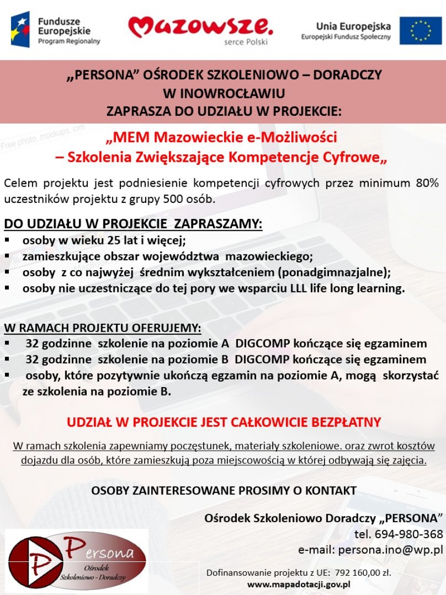 - 32 godzinne szkolenie na poziomie B DIGCOMP kończące się egzaminem