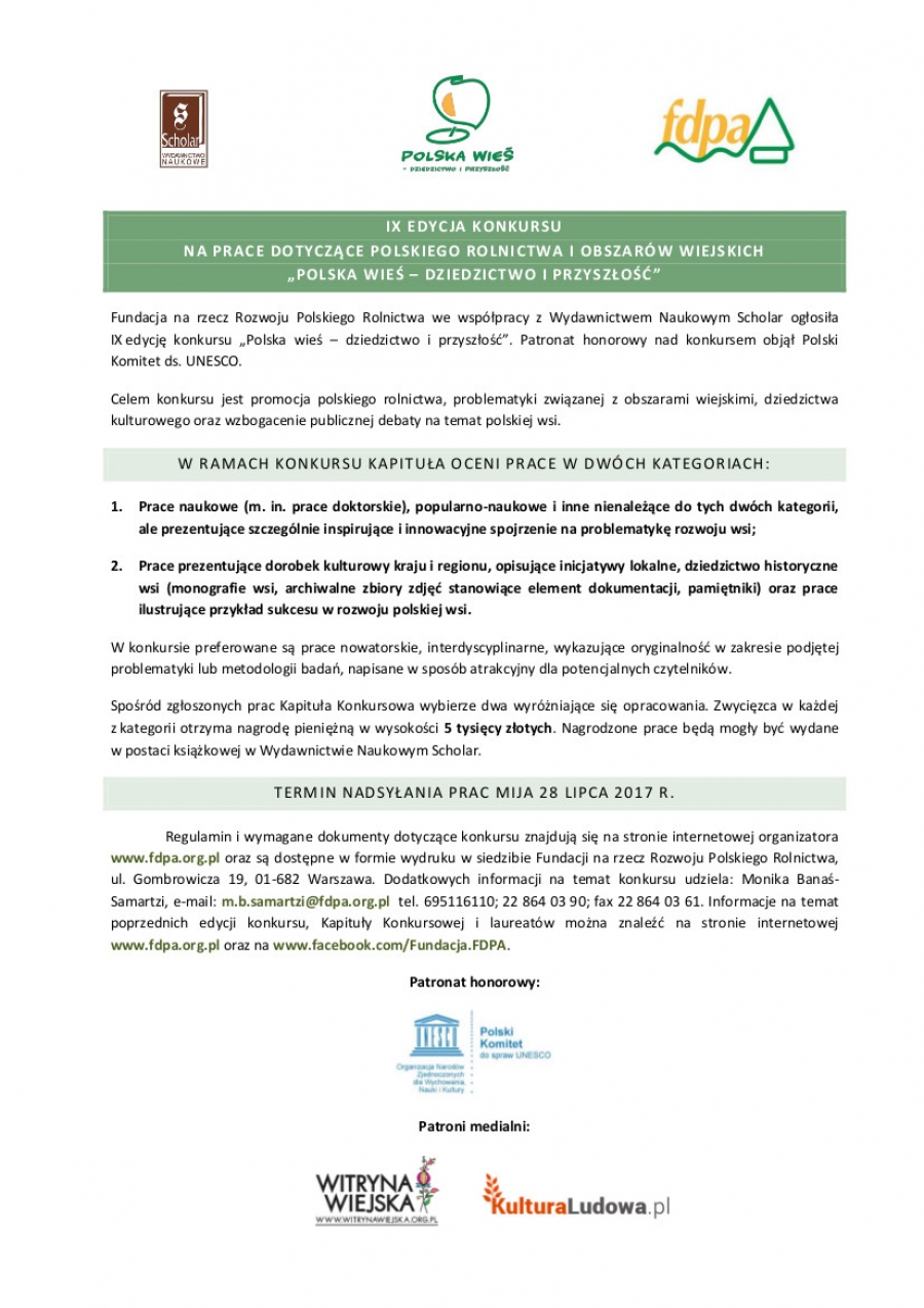 Regulamin i wymagane dokumenty dotyczące konkursu znajdują się na stronie internetowej organizatora www.fdpa.org.pl oraz są dostępne w formie wydruku w siedzibie Fundacji na rzecz Rozwoju Polskiego Rolnictwa, ul. Gombrowicza 19, 01-682 Warszawa. Dodatkowych informacji na temat konkursu udziela: Paulina Dymińska, e-mail: Ten adres pocztowy jest chroniony przed spamowaniem. Aby go zobaczyć, konieczne jest włączenie w przeglądarce obsługi JavaScript. tel. 695116110; 22 864 03 90; fax 22 864 03 61. Informacje na temat poprzednich edycji konkursu, Kapituły Konkursowej i laureatów można znaleźć na stronie internetowej www.fdpa.org.pl oraz na www.facebook.com/Fundacja.FDPA.